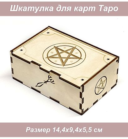 Коробка для хранения гадальных карт Таро, органайзер для Таро. Удобный, стильный ящик для хранения карт. Шкатулка для карт таро подходит для всех карт шириной до 81 мм, высотой - до 135 мм, как классических, так и современных, например таро Уэйта, Ленорман, таро Белых кошек и другие. Внутренний размер коробки 136 х 45 х 82 мм. Отличный подарок для человека, увлекающегося эзотерикой. Мешочек или футляр для колоды таро позволяет хранить позволяет не только удобно хранить, но и отлично подходит для перевозки колоды. Можно использовать для хранения игральных карт, карт для MTG и прочих. Сделана из фанеры. Так же можно использовать для хранения мелочей, косметики, аксессуаров для волос. При необходимости - вы можете покрасить ее в любой цвет, который вам нравится. Отлично получается при окрашивании с помощью водной морилки - цвет получается приглушенный, с эффектом старины, при этом красить можно в квартире - морилка на водной основе, без запаха. Но, обращаем внимание - фанеру необходимо красить в три слоя, либо использовать грунтовку.