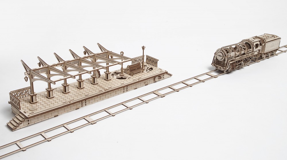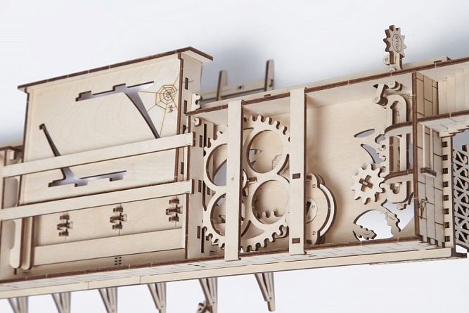 Все механические модели Ugears собираются из разнообразных деталей (экологически чистая фанера), которые «выдавливаются» из листов в наборе. При сборке ни ножницы, ни клей не нужны. Один из предложенных производителем вариантов сборки и стыковки деталей является запатентованным.