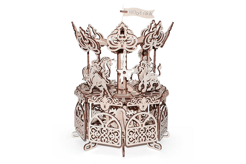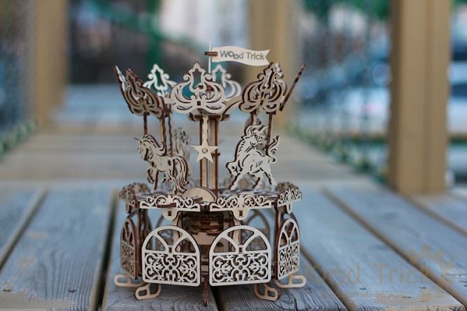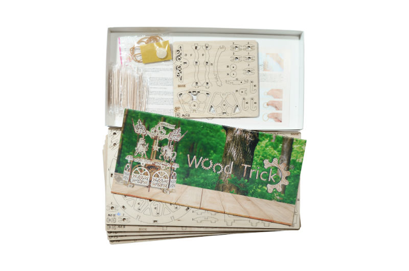 Все механические модели Wood Trick собираются из разнообразных деталей (экологически чистая фанера), которые «выдавливаются» из листов в наборе. При сборке ни ножницы, ни клей не нужны. Один из предложенных производителем вариантов сборки и стыковки деталей является запатентованным.