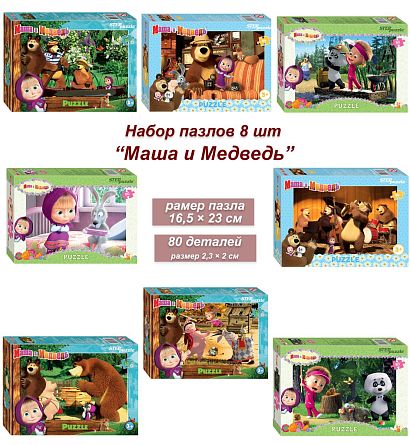 Пазлы с героями мульфильма Маша и Медведь. Стандартные детали пазла (2,3×2 см) подходят для детей от 3х лет.