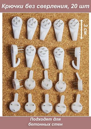 Набор крючков паучков для крепления картин без сверления (необходим только молоток, шуруповерт или отвертка не требуются). Крючки-паучки легко забиваются даже в бетонные стены (важный момент - не пытайтесь забить с одного удара, проще это сделать легкими и ровными ударами молотка). В комплект входит 20 настенных креплений, двух видов.