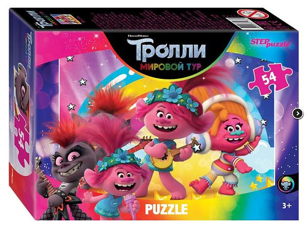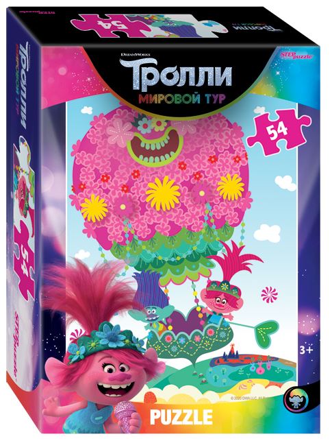 Герои мультфильма Тролли: Розочка и другие. Набор содержит 5 пазлов по 54 деталей каждый. Размер каждого пазла 18х13 см.