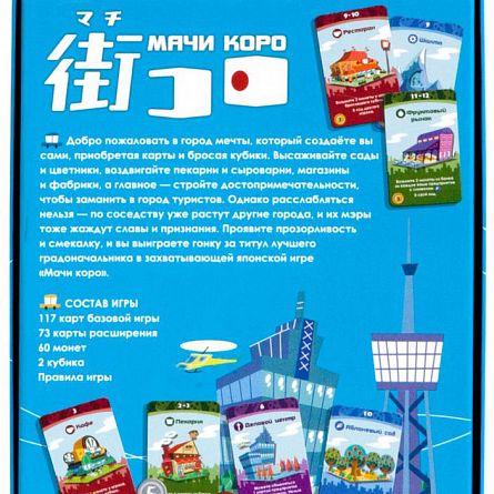 Смысл игры: Мачи Коро (Основная) - это популярная в Японии карточная игра, в которой игрокам предлагается попробовать себя в качестве градоначальников и настолько хорошо отстроить свой город на просторах Японии, чтобы он победил в состязании по городскому благоустройству - стал лидером среди других городов!