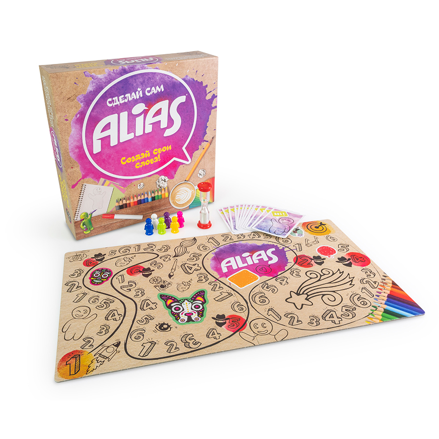 Создайте свой собственный уникальный «Алиас»! В этой версии игроки сами придумывают слова, основанные на темах на карточках. Как только у вас в уме есть слово, напишите его на карте и начинайте объяснять, и пусть другие игроки догадаются. Первый игрок, который достигнет финиша, выигрывает игру! Особенности игры Идеально подходит для игроков всех возрастов! Двусторонняя игровая доска позволяет выбрать более короткую, или длинную игру. Когда все карты будут заполнены, вы можете продолжить играть по традиционным правилам!