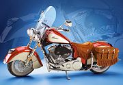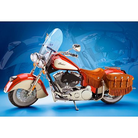 Пазл с изображением красного винтажного мотоцикла на синем фоне. Эффектный и яркий.