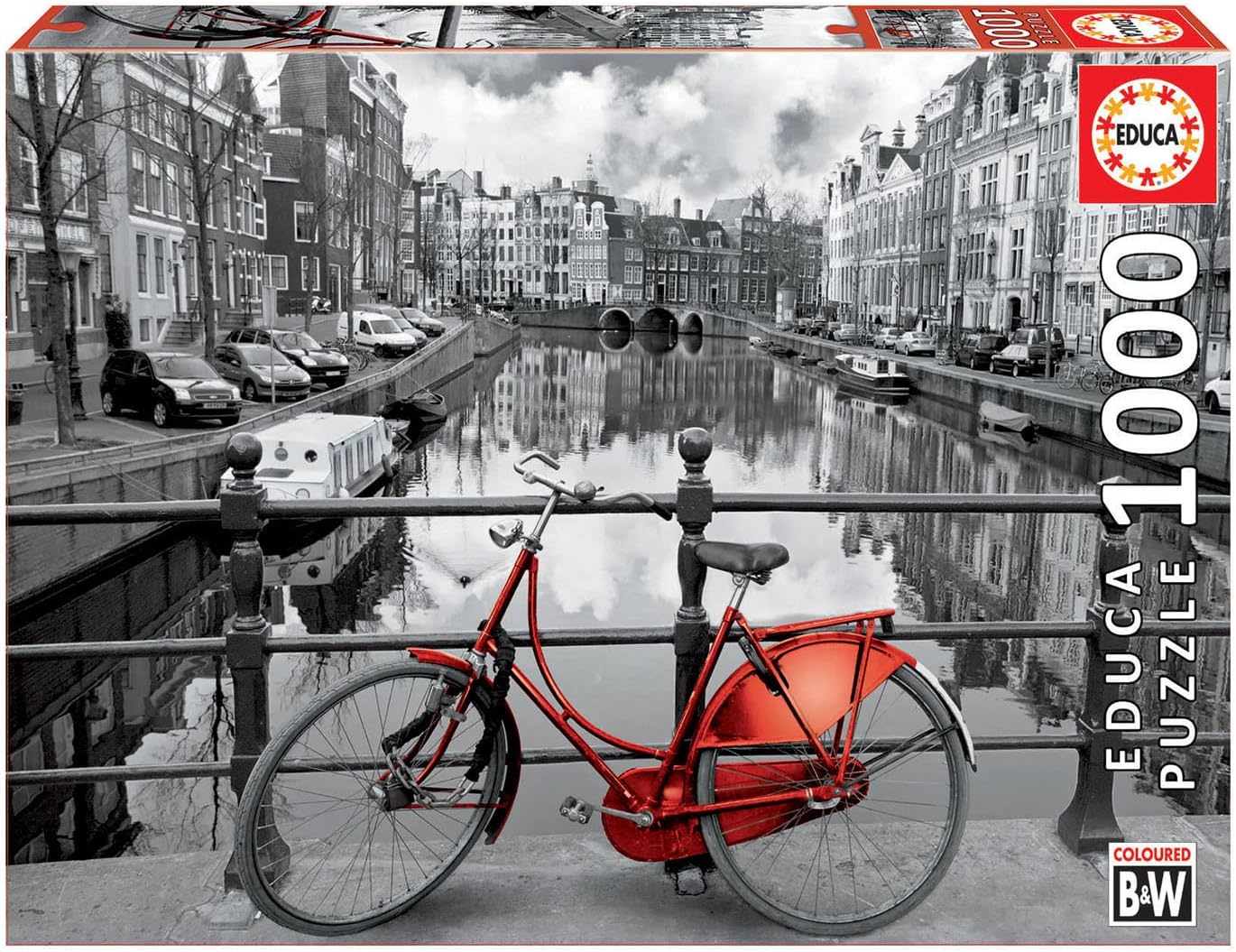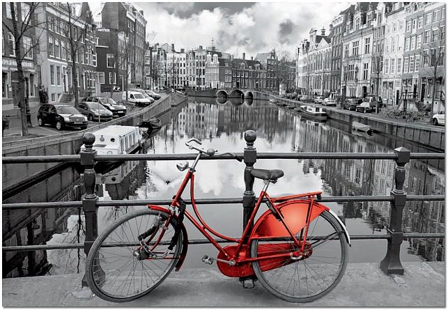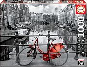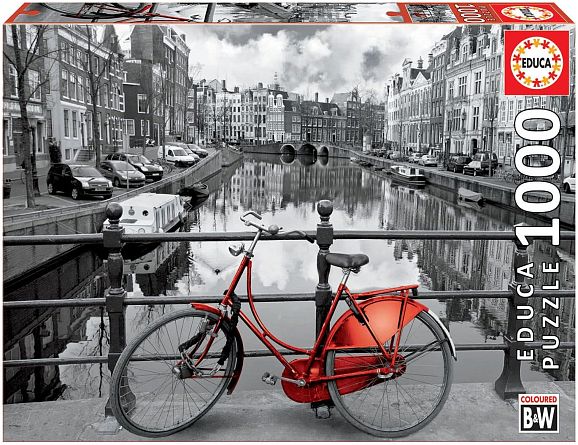 Отличная и популярная серия черно-белых пазлов с ярким элементом. Красный велосипед на фоне Амстердама