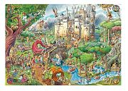 Сказки - это пазл с изображением в мультяшном стиле сказочного мира, в котором единовременно собраны персонажи множества сказок: Золушка, волк и три поросенка, дракон, Белоснежка и семь гномов и многие другие. Автор картины Хуго Прадес.