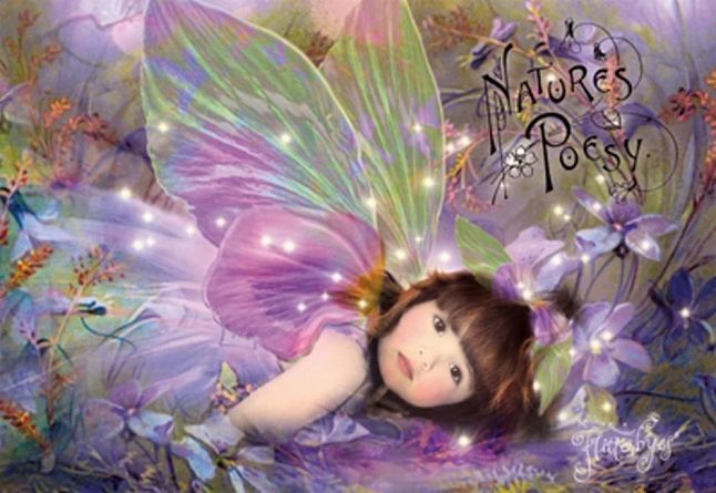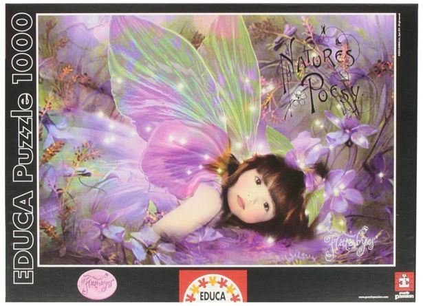 Маленькая девочка-фея отдыхает среди цветов. Волшебная пыльца сверкает и искрится над прозрачными крылышками. Нежный пазл в сиреневых тонах.