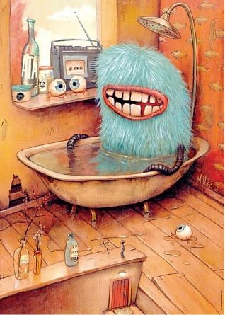 Чудо-юдо непонятное купается в старой ржавой ванне рядом с приемником на фоне ободранных стен. Автор - Mateo Dineen.