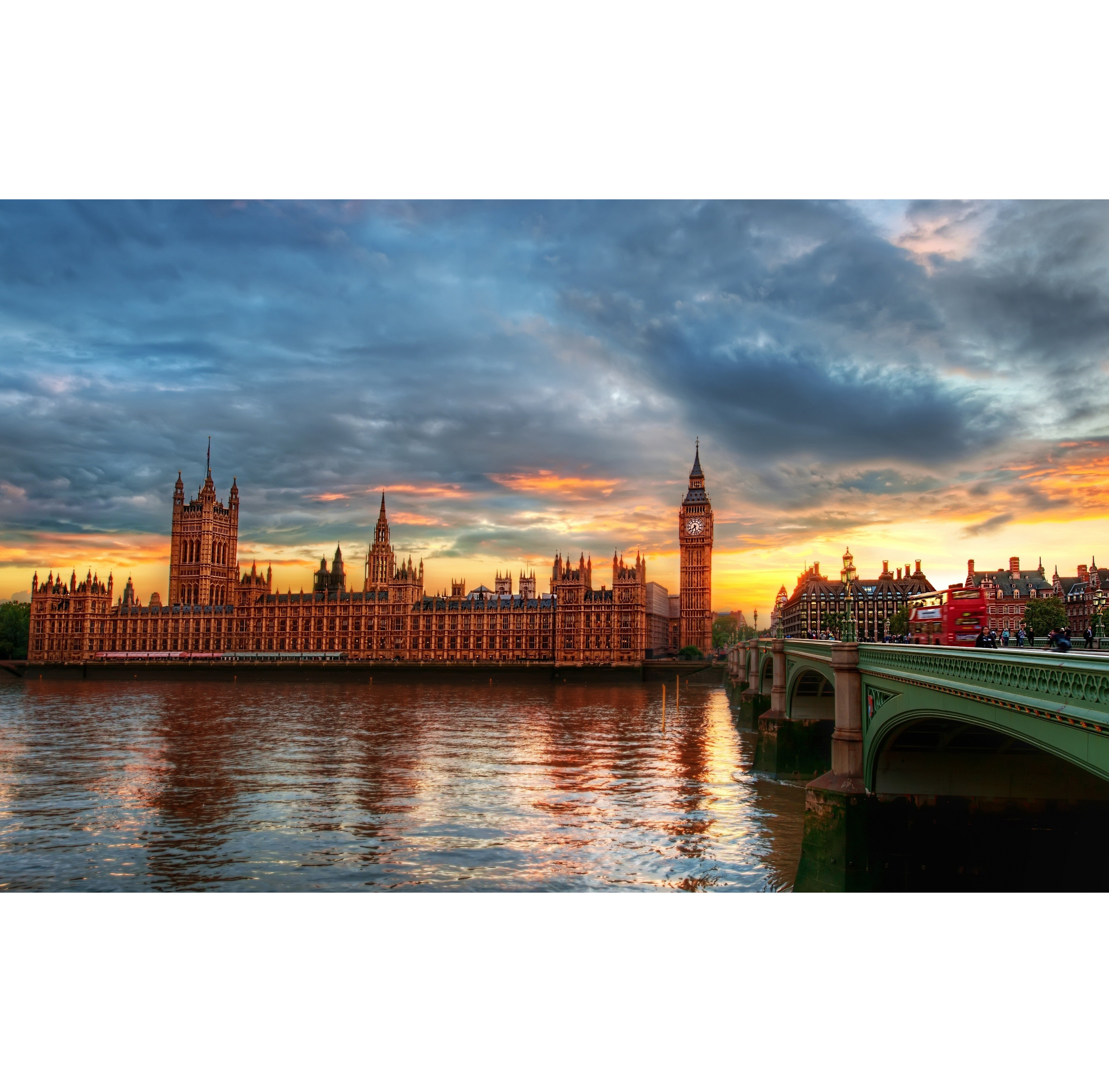 Очень красивый закат на Темзой, низкие облака, золотые лучи солнца, отражения в воде.