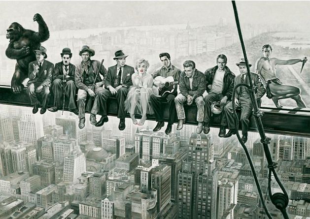 Здесь и Чарли Чаплин, и Мэрилин Монро, и Элвис Пресли, и красавец Джонни Вайсмюллер - знаменитый Тарзан на все времена, и большая горная обезьяна Кинг-Конг... Художник изобразил их отдыхающими перед съемкой, и неудивительно, что они расслабляются не на земле, а высоко в облаках. На то они и звезды, которые светят для нас недоступным светом и вдохновляют многих на большие дела и свершения!