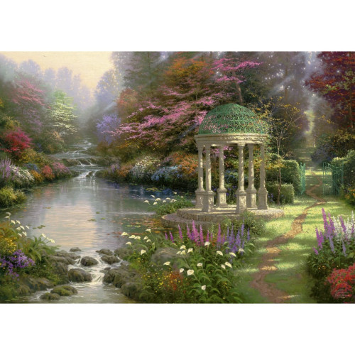 Пейзаж красивого сада, мраморная беседка стоит на берегу речной заводи, рядом проходит тропинка, ведущая в глубь сада.