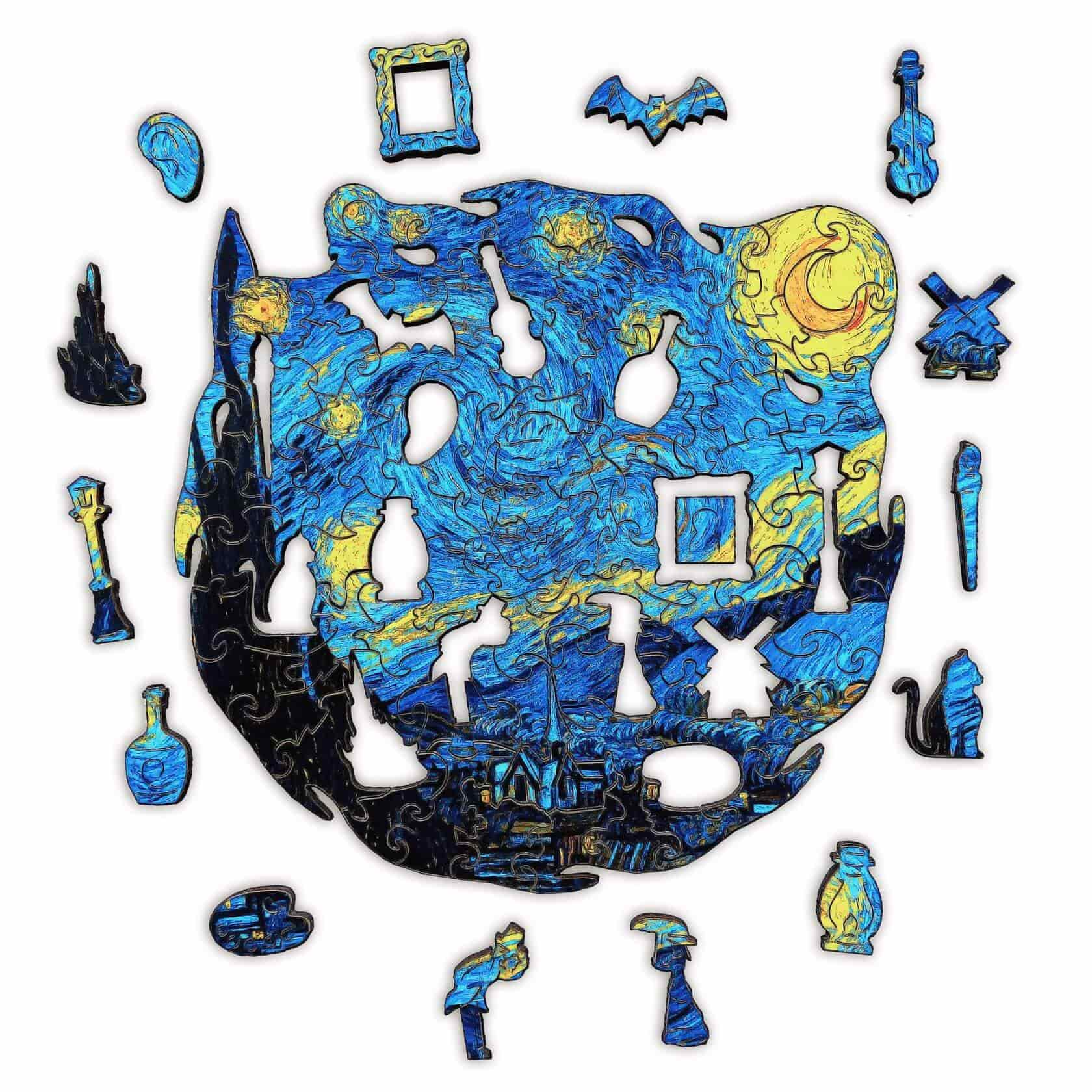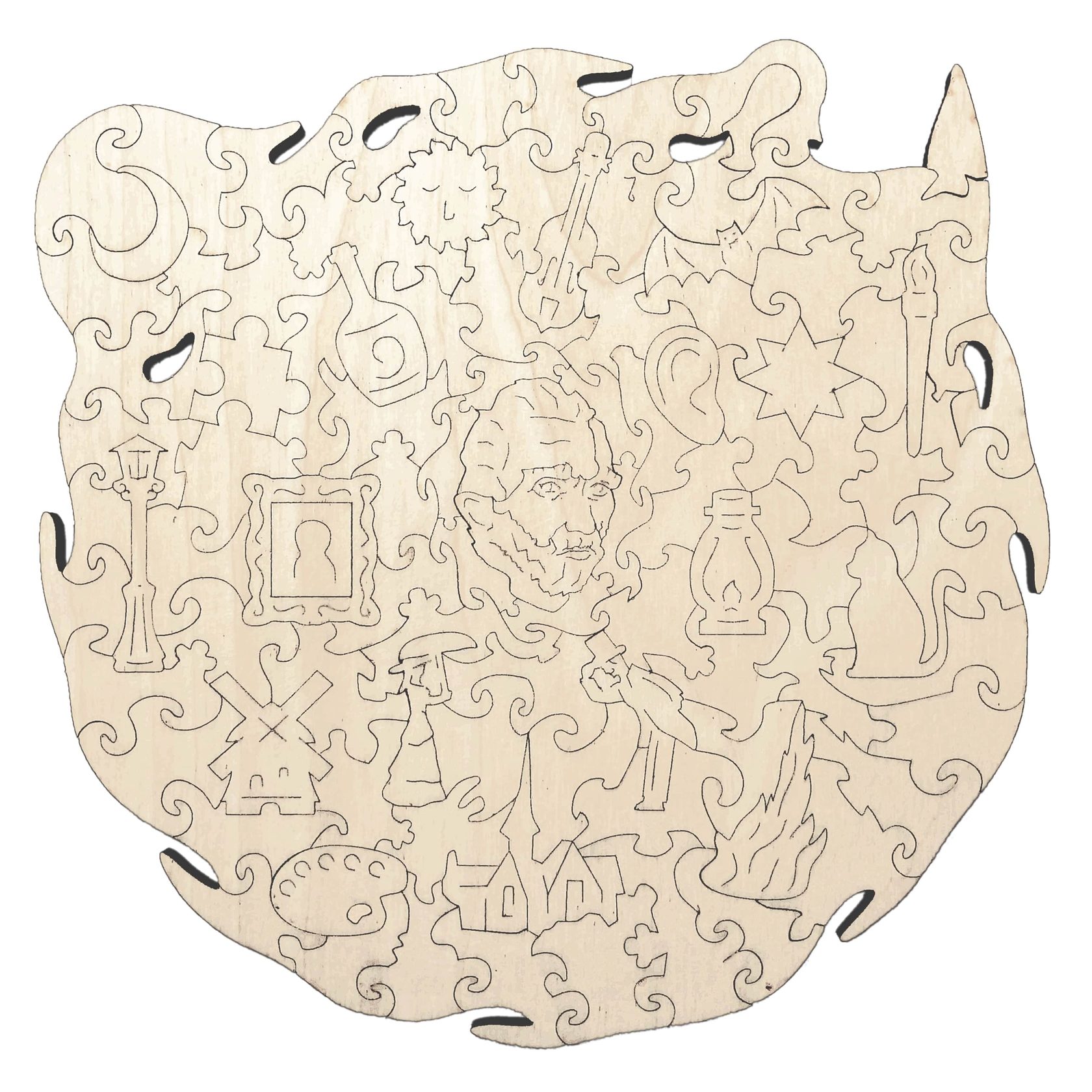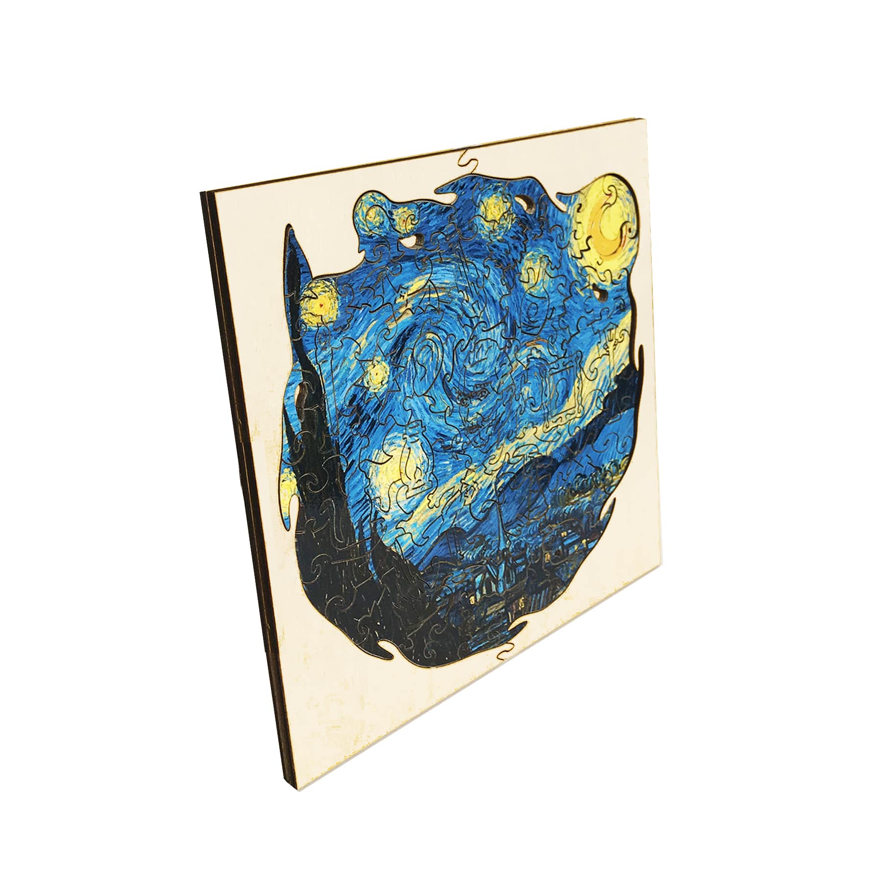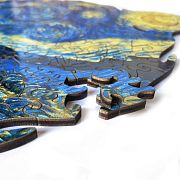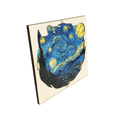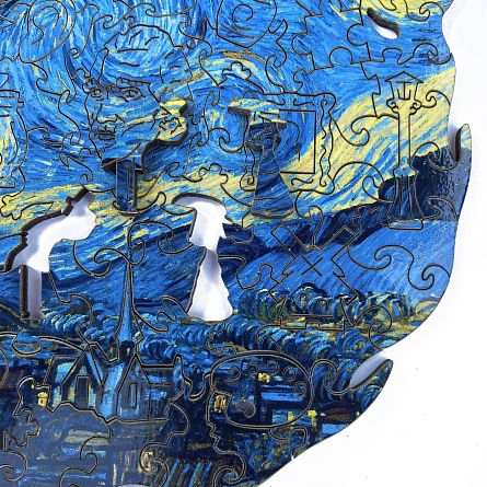 Для изготовления причудливых пазлов используется индивидуальное программное обеспечение, выводящее на древесину уникальные схемы реза. Автоматизированный лазерный сканер разрезает каждую головоломку, до миллиметров выверяя тонкие фигуры. Каждый рез вдохновлен героями и содержанием основного изображения и дополняет его, образуя картину в картине.