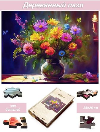 Деревянный фигурный пазл бренда 1001puzzle - уникальная настольная игра, прекрасный подарок для взрослых и для детей. Деревянная головоломка с нестандартной нарезкой состоит из 300 ярких фигурных деталей. Каждый элемент пазла - уникален, что делает сборку еще увлекательнее. Пазлы из дерева отличаются от обычных картонных надежностью и долговечностью. Кроме того, они станут прекрасным украшением интерьера, будет радовать не только в момент сборки, но и после. В нашем ассортименте есть и яркие, веселые пазлы, есть и имитация картин, пейзажи, домашние и дикие животные. Можно подобрать рисунок на любой вкус. Пазл упакован в уникальную коробку - она же служит местом для сборки, а, при желании, вы можете использовать планшет для сборки как рамку, чтобы закрепить картину и повесить ее на стену. Все пазлы мы упаковываем дополнительно в надежную транспортировочную коробку и, очень надеемся, что она поможет пережить нашему товару сложную дорогу к вам.