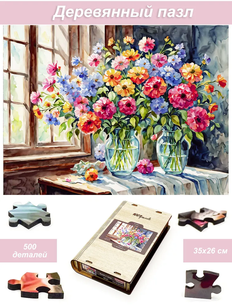 Деревянный фигурный пазл бренда 1001puzzle - уникальная настольная игра, прекрасный подарок для взрослых и для детей. Деревянная головоломка с нестандартной нарезкой состоит из 500 ярких фигурных деталей. Каждый элемент пазла - уникален, что делает сборку еще увлекательнее. Пазлы из дерева отличаются от обычных картонных надежностью и долговечностью. Кроме того, они станут прекрасным украшением интерьера, будет радовать не только в момент сборки, но и после. В нашем ассортименте есть и яркие, веселые пазлы, есть и имитация картин, пейзажи, домашние и дикие животные. Можно подобрать рисунок на любой вкус. Пазл упакован в уникальную коробку - она же служит местом для сборки, а, при желании, вы можете использовать планшет для сборки как рамку, чтобы закрепить картину и повесить ее на стену. Все пазлы мы упаковываем дополнительно в надежную транспортировочную коробку и, очень надеемся, что она поможет пережить нашему товару сложную дорогу к вам.