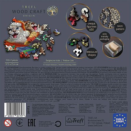 Деревянный пазл от бренда Trefl - это гибрид классической нарезки деталей и замысловатых фигур в форме животных, предметов и украшений.