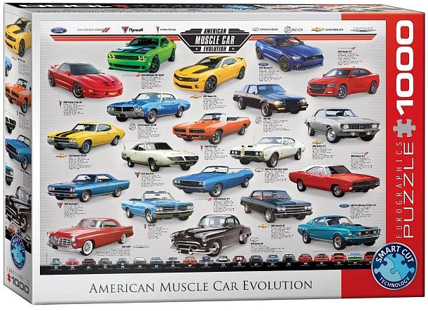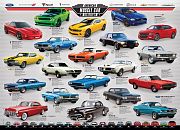 Пазл-коллаж, демонстрирующий развитие известной американской марки машины. В разные годы - разные дизайны, разный цвет, с разных сторон, плюс краткая информация об автомобиле.