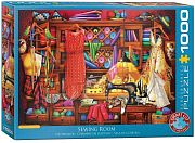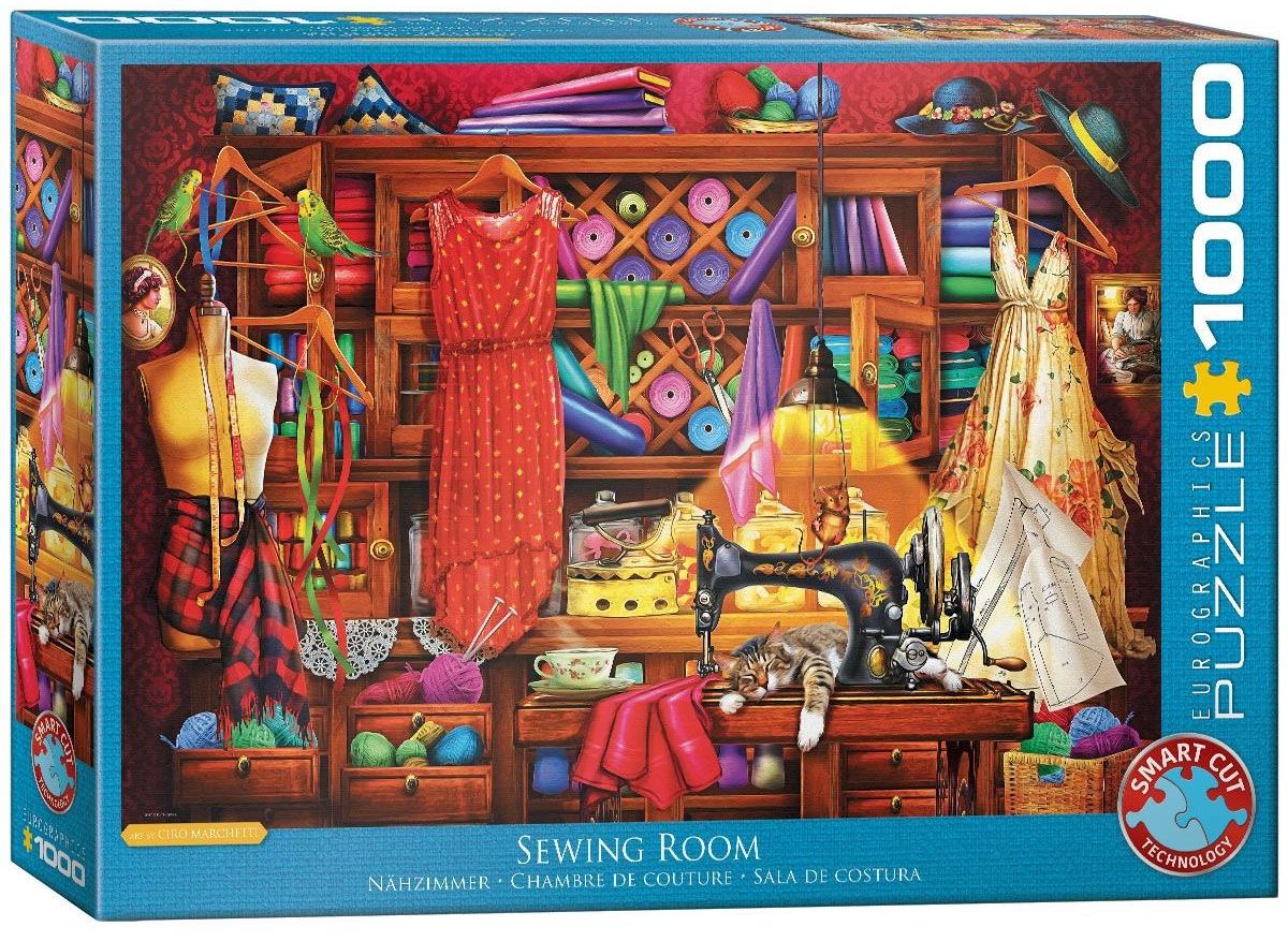 Как будет выглядеть комната любителя рукоделия? Возможно, именно так, как на этом пазле в 1000 деталей. Кусочки ткани, старинная швейная машинка, платья, ожидающие примерки. Яркая и уютная комната.