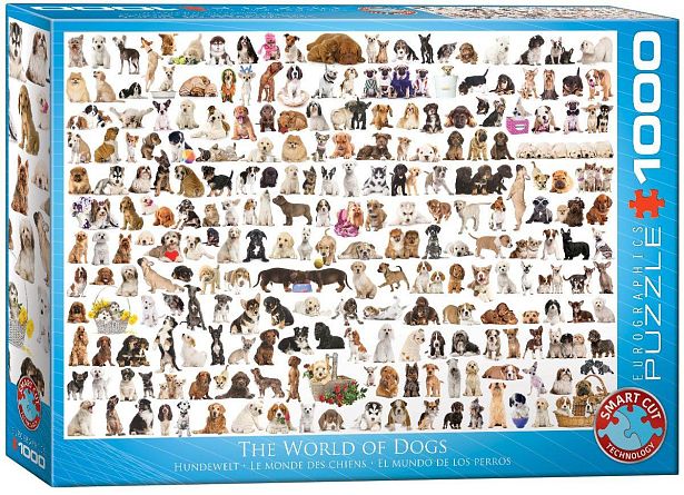 Вы не любите кошек? Тогда есть отличный пазл с собаками - огромное количество щенков, взрослых собак, разных пород и окрасов. Ни одной детали из 1000 без щенка или собаки. Собираем и наслаждаемся. Кто быстрее соберет всех йорков или всех ретриверов? Можно устроить семейное соревнование.