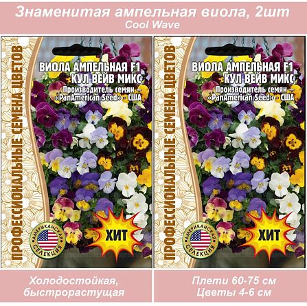 Семена ампельной виолы - это прекрасная возможность украсить сад или балкон. Кул Вейв ( Cool Wave) - самый известный и популярный гибрид. Невероятные, пышные кусты влюбят в себя с первого взгляда. Требует относительно больших кашпо - 5- 7 литров на куст. Обильные цветы образуют настоящий цветочный шар. Цветет виола непрерывно, с мая по сентябрь. Семена виолы хорошо всходят, рассада неприхотлива, без проблем переносит пересадку. Можно сажать непосредственно в открытый грунт в июне-июле, тогда виола зацветет на второй год.