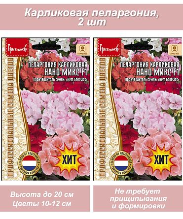 Набор семян комнатных растений карликоавя Пеларгония, 2 шт. Уникальная генетически карликовая пеларгония. Не требует прищипывания и формировки. Формирует множество крупных «шапок» соцветий на коротких цветоносах. Массовые посадки образуют сплошной цветущий ковер. Широко используется в озеленении лоджий, веранд, балконов, в бордюрных посадках, в качестве комнатного растения выращивается как многолетник. Характеризуется ранним цветением. Высота растения 18-20 см. Ширина куста 20-25 см. Диаметр соцветия 10-12 см. Пеларгония - один из самых популярных и неприхотливых цветов для сада и квартиры. Очень легко вырастить из семян, рассада развивается очень быстро, при посеве в феврале-марте уже на майские праздники будут первые цветы. В квартире пеларгония цветет практически весь год. Семена герани высаживают на глубину около 1 см, всходы могут появляться не дружно, постепенно, в течении месяца, это норма для данных растений. Для ускорения всходов можно прорастить семена на влажной салфетке, такой способ дает отличные результаты и 100% всхожесть. В открытый грунт можно высаживать после прекращения заморозков, обычно - в середине мая.