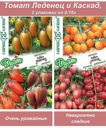 Набор семян томатов Леденец и Каскад, 0,15 г в каждом пакете (по 0,05 г каждого сорта). Сорт томатов Леденец - новинка, настоящая гордость российской селекции. Отличается урожайностью, длительным плодоношением, невероятно сладкими томатами с изумительным вкусо. Растение высокорослое, мощное, индетерминантное, для теплиц и открытого грунта (в зависимости от региона). Данный томат - однозначно станет вашим любимцем, его обожают и взрослые, и дети. Семена томата сохраняют всхожесть до 10 лет, всходят легко и дружно. Сорт томатов Каскад - известен и популярен уже очень давно. Невероятно урожайный, высокорослый, средне и раннеспелый, очень вкусный - посадив один раз, уже невозможно отказаться от него. В данном наборе представлены семена трех вариантов томатов Каскад - яркие, разные по форме и размеру, но все - очень эффектные. Прекрасно подходит для вяления, употребления в свежем виде, приготовления ярких, летних салатов, соусов, консервирования и замораживания. Семена томата сохраняют всхожесть до 10 лет, а, т.к. это сорт, а не гибрид - можно заготовливать свои семена, они сохранят сортовые качества. Идеально подходят для выращивания эффектных декоративных "деревьев" из помидор - посадите несколько кустов на улице, не на грядке, а, например, около забора/строения и удаляйте не более 20-30% пасынков - у вас вырастет большой куст с огромным количеством маленьких ярких черри - очень красиво и вкусно, хотя размер плодов будет несколько меньше, чем при пасынковании. Лучше всего для такого выращивания выбрать ранние сорта.