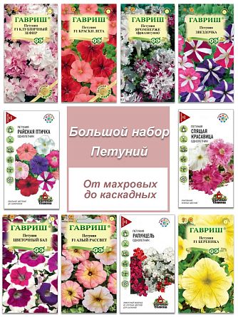 "Петуния - один из самых популярных однолетних цветов, отличается разнообразием видом и сортов. В данном наборе - самый большой в нашем ассортименте, все цветы - смесь окрасок, т.е. у вас есть возможность получить огромное разнообразие цветов, форм, оттеноков. В набор входят и крупноцветковые петунии, и мелкоцветковые, бахромчатые и ампельные. Все петунии выращиваются через рассаду, посев - с января до конца марта. Ранний посев даст возможность получить более раннее цветение, большие яркие кусты уже в мае-июне, но, обратите внимание - при посадке в январе и феврале ОБЯЗАТЕЛЬНА подсветка рассады. Семена раскладывают на поверхность влажной, слегка утрамбованной земли. НЕ прикапывать. Ампельные и махровые сорта прорастают дольше других, их сажают раньше. Идеальная температура прорастания 25-30 градусов. При более низкой - результаты хуже, пожалуйста, учитывайте это, если выращиваете рассаду на подоконнике - измерьте там температуру. Хорошие результаты дает посадка на снег -на уплотненную землю кладете 0,5 см утрамбованного снега, на него раскладываете семена, закрываете пленкой или стеклом. Очень важно, чтобы семена петунии были постоянно увлажнены и не пересыхали. Всходы появляются на 10-15 дней. После появления 2-3 пар настоящих листьев петунию пикируют в горшочки 100 мм, выращивают при температуре 18-20 градусов, здесь как раз прохладное окно пойдет на пользу. По мере роста и пересадки рассады - температуру можно повысить до 20-22 градусов. В целом, подобные измения температуры обычно происходят сами - в апреле и мае на подоконнике становится как раз на пару градусов теплее, чем в марте. Высаживают в грунт, когда минует угроза заморозков. Как и любая другие петунии, цветы в наборе довольно требовательны к питательным веществам и отлично реагирует на подкормки комплексными минеральными удобрениями, можно подкармливать и пролонгированными удобрениями и самой простой азофоской - (столовая ложка на 10 литров воды, 1 раз в неделю).