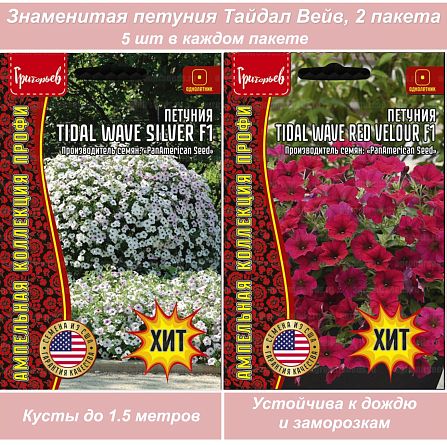 "Набор семян, семена Петунии Тайдал Вейв. Петуния из серии Tidal wave - уже давно признана и любима и профессионалами, и любителями по всему миру. Гибриды этой серии обладают невероятной скоростью и мощью роста, превосходит большинство суперкаскадных петуний. На каждом растении образуется до сотни ярких, бархатистых цветков. Великолепно держит форму, не требует формирования куста. Тайдал вейв всегда развивается равномерно, куст набивной, весь покрытый цветами, за которыми не видно листьев. Петуния Тайдал в грунте - это огромный куст шириной около полутора метров. Очень эффектно выглядит в подвесных кашпо и балконных ящиках (но, обратите внимание, требовательны к объему - минимум 20-30 литров, но, чем больше - тем больше и красивее будет куст. Семена петунии Тайдал можно сеять на рассаду, начиная с января-февраля, но - необходимо использовать подсветку (достаточно обычной светодиодной линейной лампы мощностью от 35 Вт), при посеве в марте - можно обойтись без подсветки. Семена петунии раскладываются на поверхностью влажного, слегка утрамбованного грунта, в небольшие (около 1 мм глубиной) ямки, сделанные карандашом, обрызгиваются из пульвиризатора и накрываются стеклом или пленкой. ВНИМАНИЕ! Семена НЕ ПРИСЫПАТЬ грунтом, они лежат на поверхности земли. Очень важно, чтобы семена петунии были постоянно увлажнены и не пересыхали. Всходы появляются на 10-15 дней, температура проращивания - 25-30 градусов. Обратите, пожалуйста, внимание, на этот момент - многие ставят лотки на подоконник, но там часто - слишком холодно для прорастания семян. После появления 2-3 пар настоящих листьев петунию пикируют в горшочки 100 мм, выращивают при температуре 18-20 градусов, здесь как раз прохладное окно пойдет на пользу. По мере роста и пересадки петунии - температуру можно повысить до 20-22 градусов. В целом, подобные измения температуры обычно происходят сами - в апреле мае на подоконнике становится как раз на пару градусов теплее, чем в марте. Петунию высаживают в грунт, когда минует угроза заморозков. Тайдал Вейв, как и любая другая петуния очень требовательна к питательным веществам и отлично реагирует на подкормки комплексными минеральными удобрениями.
