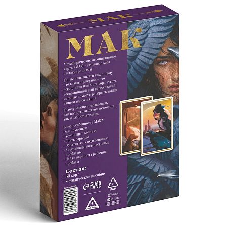 Карты помогают мягко работать с подсознанием, находить ответы на внутренние вопросы, анализировать эмоции и жизненные ситуации.Психологические МАК карты широко используются психологами, коучами, тренерами и специалистами по личностному развитию, а также подходят для самостоятельной работы. Каждая карта содержит образ или метафору, которые помогают раскрыть внутренние переживания, взглянуть на ситуацию с новой стороны и найти решение.