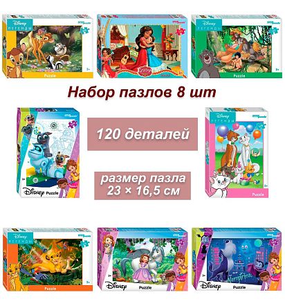Король Лев, Бэмби, Маугли, Вампирина, Принцесса София, Елена - принцесса Авалора , Веселые Мопсы, Коты аристократы - вот что ждет в наборе пазлов от бренда Step.