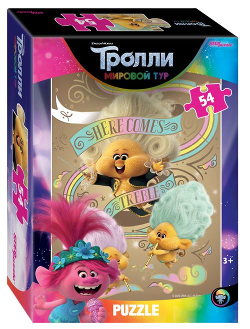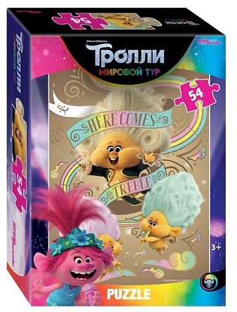 Герои мультфильма Тролли: Розочка и другие. Набор содержит 5 пазлов по 54 деталей каждый. Размер каждого пазла 18х13 см.