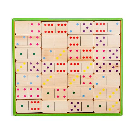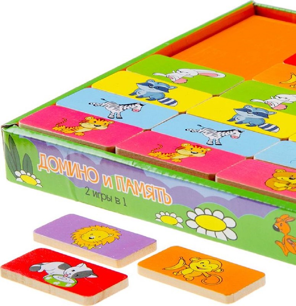 - Уникальный формат 2 в 1: На одной стороне деревянных плиток — традиционное домино, на другой — яркие картинки для игры в «Мемо» (Память).