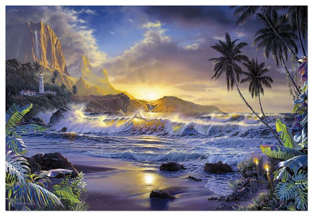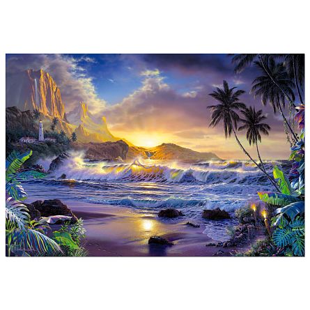 Морской пейзаж на закате. Пальмы, волны, лучи уходящего солнца.