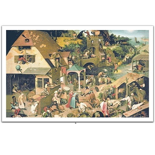 Фламандские пословицы, другое название - «Мир вверх тормашками». Картина создана в 1559 году, она изображает буквальные значения пословиц из фольклёра нидерландов.