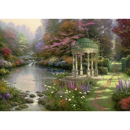 Пейзаж красивого сада, мраморная беседка стоит на берегу речной заводи, рядом проходит тропинка, ведущая в глубь сада.