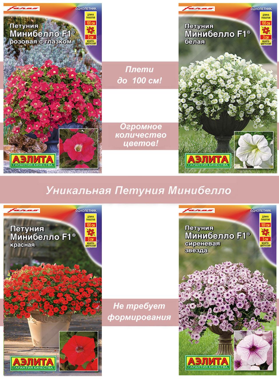 "Набор семян, семена Петунии Минибелло. По силе, обилию и продолжительности цветения Петуния Минибелло итальянской селекции не имеет равных - все растение усыпано огромным количеством мелких цветов. Побеги достигают 100 см, активно ветвятся вверх и в стороны, середина куста никогда не бывает оголенной. Использование этого гибрида просто безгранично - великолепно смотрится и в кашпо, и в балконных ящиках, и в цветниках в открытом грунте. Семена петунии можно сеять на рассаду, начиная с января-февраля, но - необходимо использовать подсветку (достаточно обычной светодиодной линейной лампы мощностью от 35 Вт), при посеве в марте - можно обойтись без подсветки. Семена петунии раскладываются на поверхностью влажного, слегка утрамбованного грунта, в небольшие (около 1 мм глубиной) ямки, сделанные карандашом, обрызгиваются из пульвиризатора и накрываются стеклом или пленкой. ВНИМАНИЕ! Семена НЕ ПРИСЫПАТЬ грунтом, они лежат на поверхности земли. Очень важно, чтобы семена петунии были постоянно увлажнены и не пересыхали. Всходы появляются на 10-15 дней, температура проращивания - 25-30 градусов. Обратите, пожалуйста, внимание, на этот момент - многие ставят лотки на подоконник, но там часто - слишком холодно для прорастания семян. После появления 2-3 пар настоящих листьев петунию пикируют в горшочки 100 мм, выращивают при температуре 18-20 градусов, здесь как раз прохладное окно пойдет на пользу. По мере роста и пересадки петунии - температуру можно повысить до 20-22 градусов. В целом, подобные измения температуры обычно происходят сами - в апреле мае на подоконнике становится как раз на пару градусов теплее, чем в марте. Петунию высаживают в грунт, когда минует угроза заморозков.