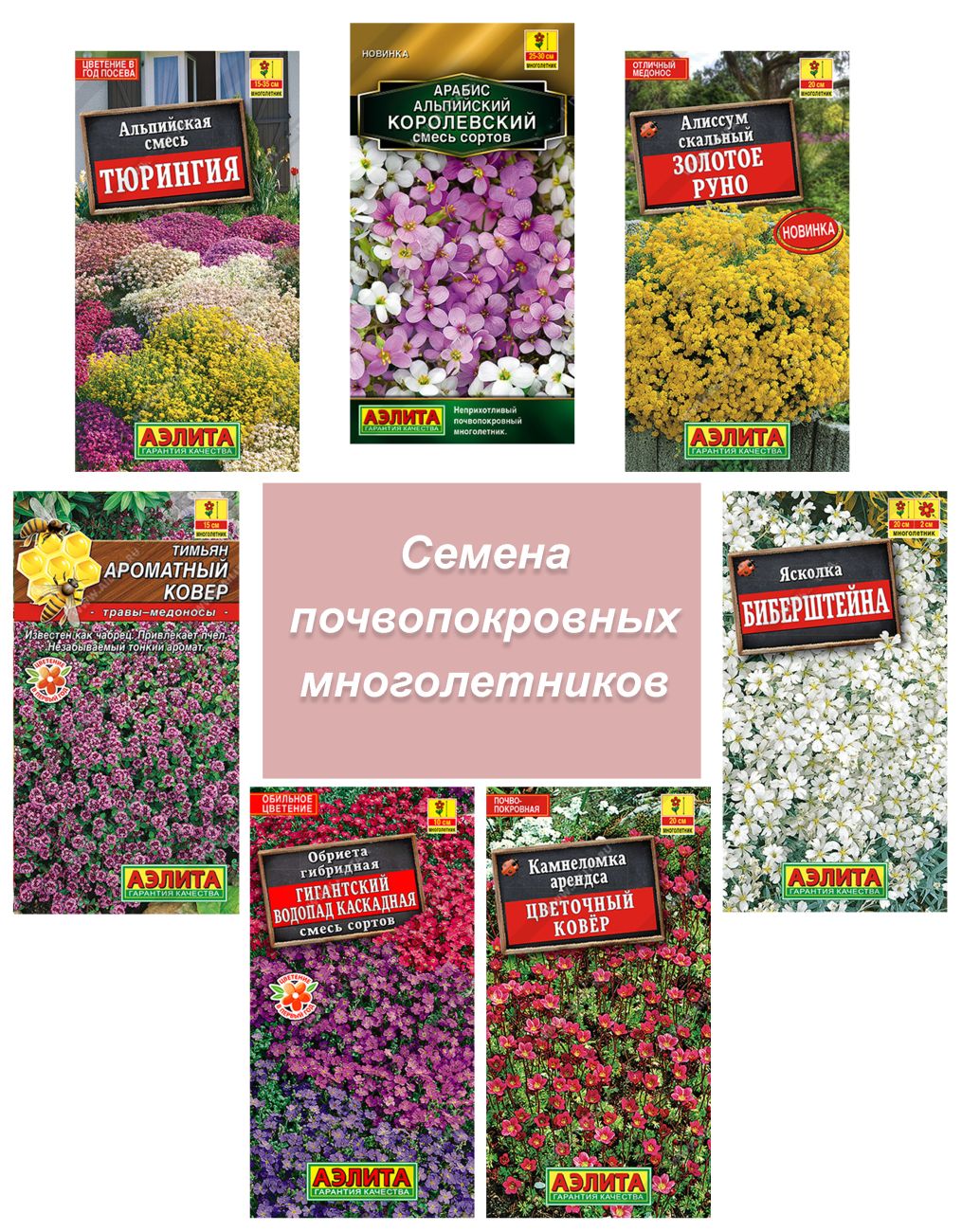 Почвопокровные многолетние цветы - самые популярные многолетники, отлично смотрятся и на клумбах, и на альпийских горках. Отличный способ сделать клумбу без сорняков. Несмотря на то, что многие семена можно сажать непосредственно в открытый грунт, мы не рекомендуем этого делать. В отличии от однолетних цветов, многолетники растут медленно, при посеве сразу на постоянное место легко перепутать с сорняками. Пока ростки молодые - необходимо контролировать влажность, гораздо проще это делать при посеве в контейнеры, а уже подросшие всходы пересаживать на постоянное место. Низкорослые цветы отлично смотрятся не только в клумбах, но и в кашпо.