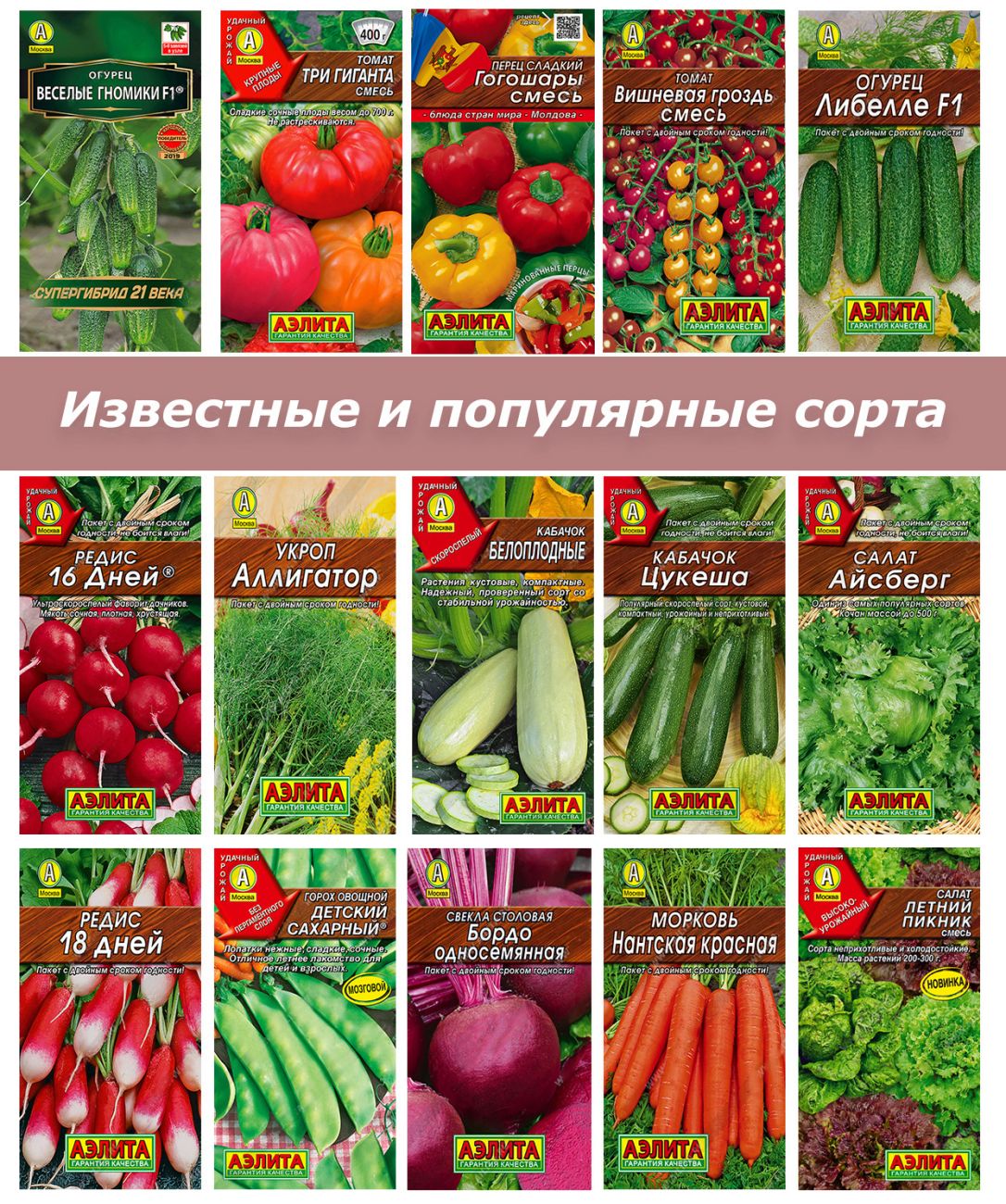 Семена проверенных сортов и гибридов в большом наборе от агрокомпании Аэлита. Семена овощей, зелени, томатов, кабачков, редиса и так далее. Горох - высочайшая урожайность и отличный вкус. Семена салата - известнейшие сорта, листовой и полукочанный, очень вкусные и красивые. Укроп Аллигатор известен большинству садоводов, бессменный лидер среди укропов. Посадив семена кабачков из набора - вы завалите плодами не только себя, но и соседей. Семена моркови - один из самых распространенных сортов, крупная, сладкая, отлично хранится. Семена огурцов в наборе - скороспелые, очень урожайные. Редис - сочный, скороспелый, нежный. Свекла - урожайная, с великолепнейшим вкусом. Семена томатов позволят получить урожая на любой вкус - и сладкие яркие черри, так любимые и взрослыми, и детьми, и крупные, салатные помидоры с отличными вкусовыми качествами.