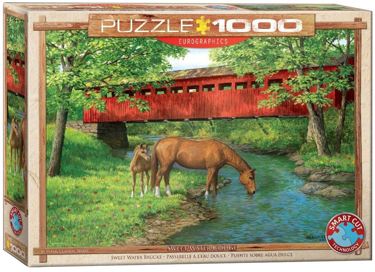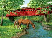 Очаровательный перйзаж с лошадьми у реки на водопое. Старый красный мост на заднем плане, умиротворение, спокойствие.